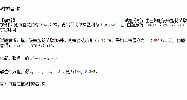 某花圃用花盆培育某种花苗,经过实验发现每盆的盈利与每盆的株数构成一定的关系.每盆植入3株时,平均单株盈利3元;以同样的栽培条件,若每盆增加1株,平均单株盈利就减少0.5元.要使每盆的盈利达到10元,每盆应该植多少株?