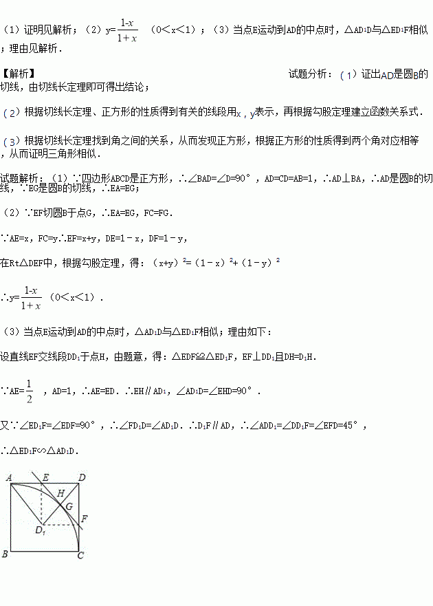 是以点B为圆心,AB长为半径的圆的一段弧,点E是边AD上的动点(点E与点A,D不重合),过E作