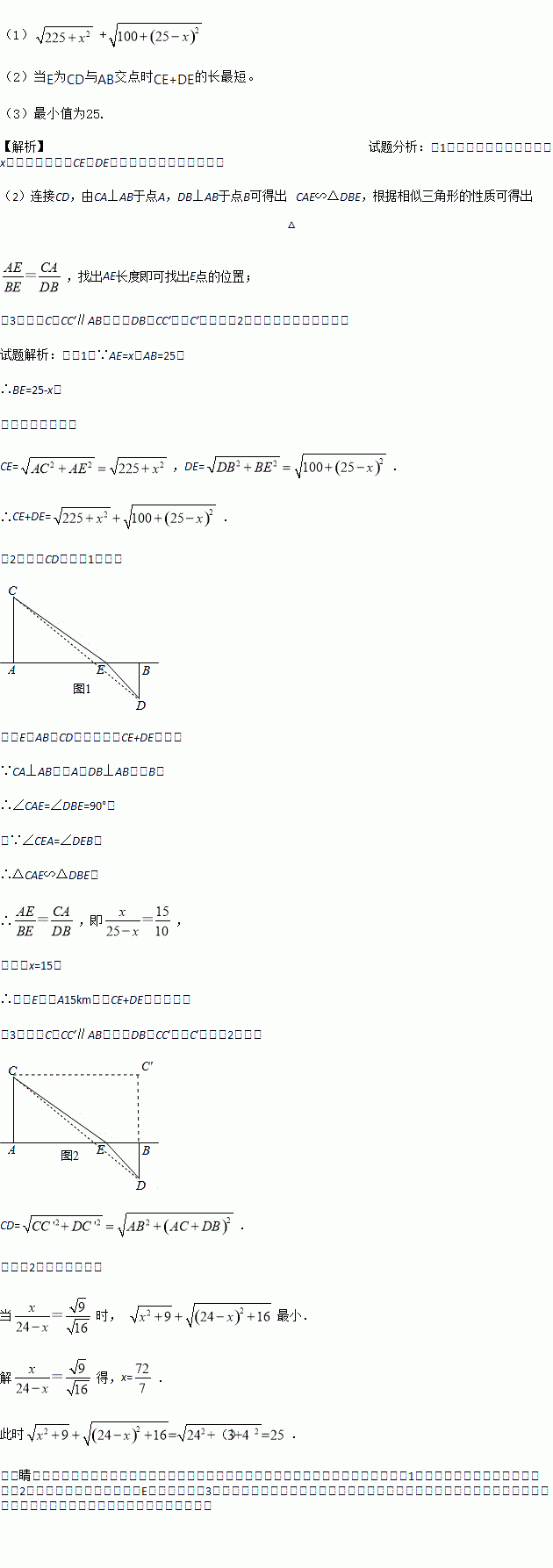 如图所示铁路上A..B两站(视为两个点)相距25km,C.D为两村庄(视为两个点),CA⊥AB于点A,DB⊥AB于点B,已知CA=15km,DB=10km.现要在A.B之间建一个土特产收购站E,当AE=xkm时,(1)求CE+DE的长。(用含x的式子表示)