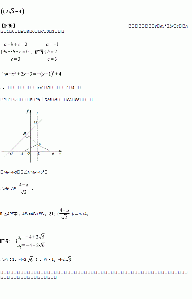 已知抛物线y=ax 2+bx+c经过A(-1,0)、B(3,0)、C(0,3)三点,顶点为D,点P是抛物线的对称轴上一点,以点P为圆心的圆经过A、B两点,且与直线CD相切,则点P的坐标为_______________。