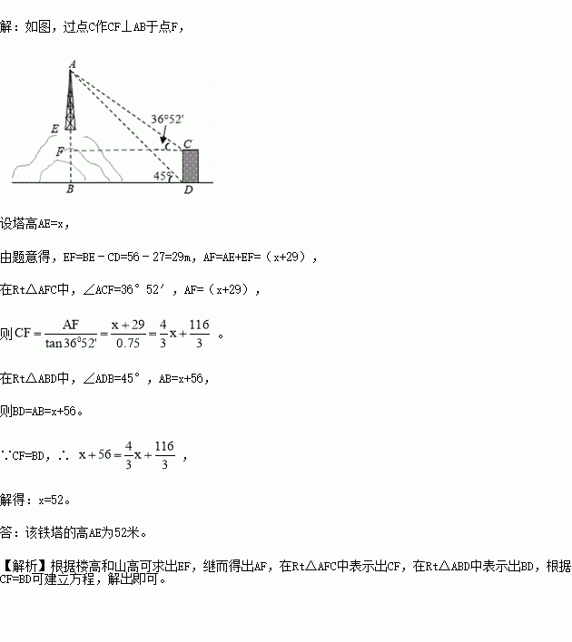 如图,为了测量山顶铁塔AE的高,小明在27m高的楼CD底部D测得塔顶A的仰角为45°,在楼顶C测得塔顶A的仰角36°52′.已知山高BE为56m,楼的底部D与山脚在同一水平线上,求该铁塔的高AE.(参考数据:sin36°52′≈0.60,tan36°52′≈0.75)