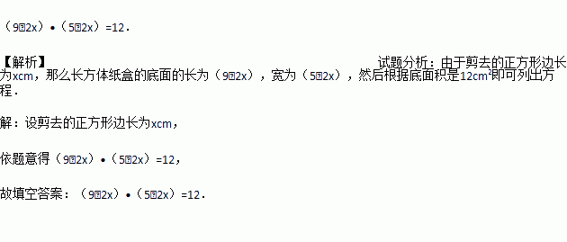 如图是一张长9cm、宽5cm的矩形纸板,将纸板四个角各剪去一个同样的正方形,可制成底面积是12cm2的一个无盖长方体纸盒,设剪去的正方形边长为xcm,则可列出关于x的方程为___________________.