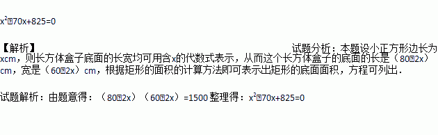 现有一块长80cm、宽60cm的矩形钢片,将它的四个角各剪去一个边长为xcm的小正方形,做成一个底面积为1500cm2的无盖的长方体盒子,根据题意列方程,化简可得 .