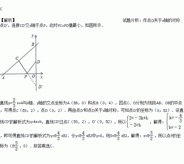 x+4与x轴、y轴分别交于点A和点B,点C,D分别为线段AB,OB的中点,点P为OA上一动点,PC+PD值最小时点P的坐标为.