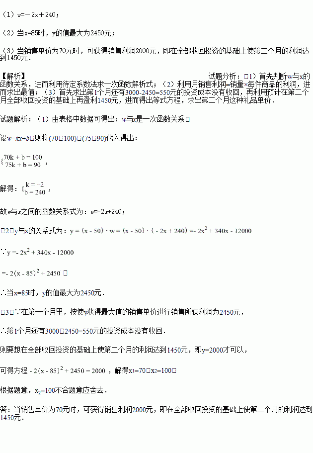 温州龙港礼品城某店经销一种工艺品,已投资3000元进行店面装修.已知这种工艺品单个成本50元.据调查,销量w(个)随销售单价x(元/ 个)的变化而变化,具体变化规律如下表所示设该店销售这种工艺品的月销售利润为y(元)