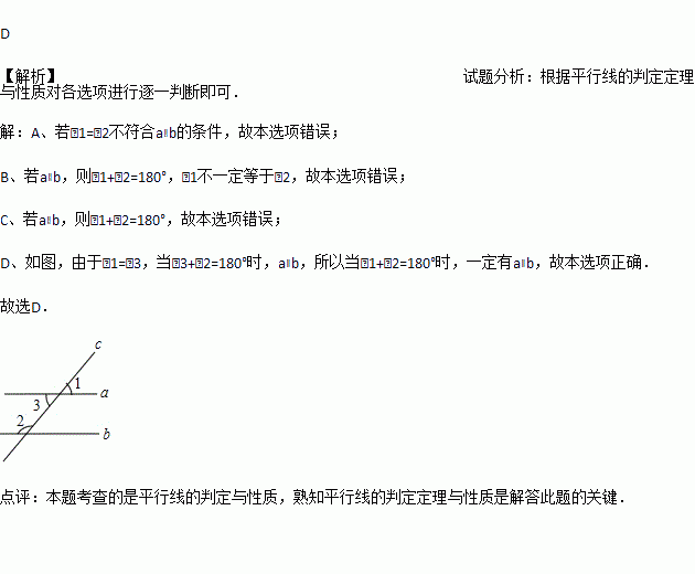 D. 当∠1+∠2=180°时,一定有a∥b
