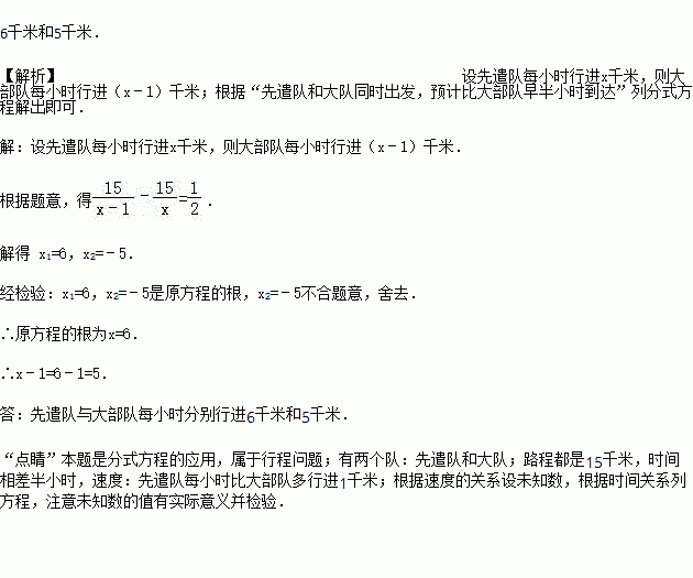 某中学八年级学生到离学校15千米的青少年营地举行庆祝十四岁生日活动,先遣队与大部队同时从学校出发.已知先遣队每小时比大部队多行进1千米,预计比大部队早半小时到达目的地.求先遣队与大部队每小时各行进了多少千米.