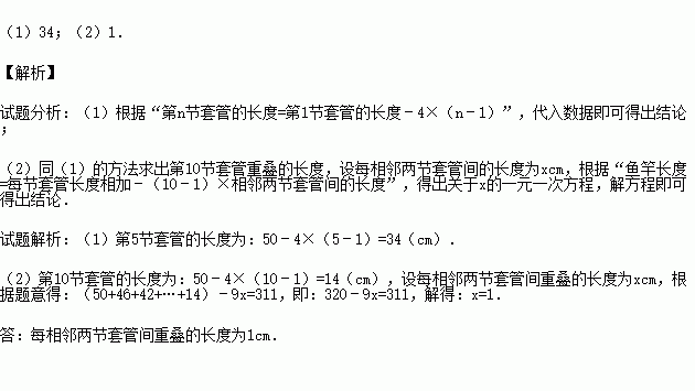 如图是一根可伸缩的鱼竿,鱼竿是用10节大小不同的空心套管连接而成.闲置时鱼竿可收缩,完全收缩后,鱼竿长度即为第1节套管的长度(如图1所示):使用时,可将鱼竿的每一节套管都完全拉伸(如图2所示).图3是这跟鱼竿所有套管都处于完全拉伸状态下的平面示意图.已知第1节套管长50cm,第2节套管长46cm,以此类推,每一节套管均比前一节套管少4cm.完全拉伸时,为了使相邻两节套管连接并固定,每相邻两节套管间均有相同长度的重叠,设其长度为xcm.