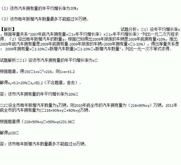 (2)为保护城市环境,缓解汽车拥堵状况,该市交通部门拟控制汽车总量,要求到2011年底全市汽车拥有量不超过231.96万辆;另据估计,从2010年初起,该市此后每年报废的汽车数量是上年底汽车拥有量的10%.假定每年新增汽车数量相同,请你计算出该市每年新增汽车数量最多不能超过多少万辆?