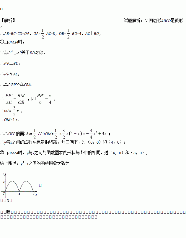 如图,菱形ABCD的对角线AC与BD交于点O,AC=6,BD=8.动点E从点B出发,沿着B﹣A﹣D在菱形ABCD的边上运动,运动到点D停止.点F是点E关于BD的对称点,EF交BD于点P,若BP=x,△OEF的面积为y,则y与x之间的函数图象大致为( )