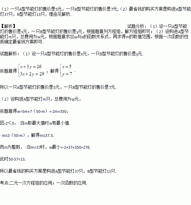 (2)学校准备购进这两种型号的节能灯共50只,并且A型节能灯的数量不多于B型节能灯数量的3倍,请设计出最省钱的购买方案,并说明理由.