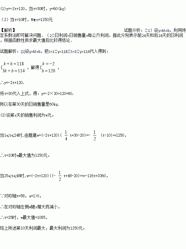 ,且其日销售量y(kg)与时间t(天)的关系如下表:
