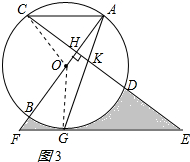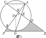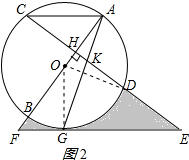(2)与已知条件得出∠HAK=30°,HK=$\frac{1}{3}$DH=$\frac{\sqrt{15}}{3}$,AH=$\sqrt{3}$HK=$\sqrt{5}$,连接OD,设⊙O的半径为R,在Rt△ODH中,由勾股定理得出方程,解方程求出半径,得出OH=$\frac{1}{2}$OD,求出∠ODH=30°,△ODH的面积=$\frac{5\sqrt{3}}{2}$,再求出∠BOD=120°,得出扇形OBGD的面积=$\frac{20π}{3}$,证明△GEK是等边三角形,求出OF=2OG=4$\sqrt{5}$,得出HF=OH+OF=5$\sqrt{5}$,求出HE=$\frac{5\sqrt{15}}{3}$,计算出△EFH的面积,即可得出结果;