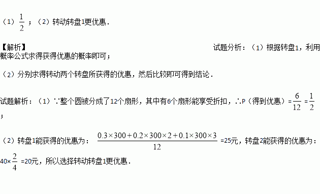 (1)若他选择转动转盘1,则他能得到优惠的概率为多少?