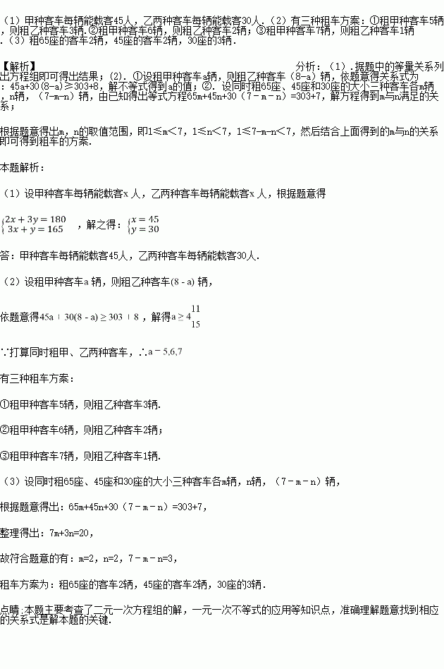 在“五•一”期间,某公司组织员工到扬州瘦西湖旅游,如果租用甲种客车2辆,乙种客车3辆,则可载180人,如果租用甲种客车3辆,乙种客车1辆,则可载165人.