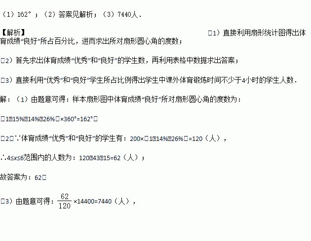 (3)全市初三学生中有14400人的体育测试成绩为“优秀”和“良好”,请估计这些学生中课外体育锻炼时间不少于4小时的学生人数.