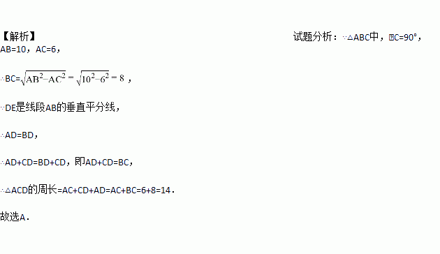 如图,△ABC中,∠C=90°,AB的中垂线DE交AB于E,交BC于D,若CB=8,AC=6,则△ACD的周长为( )