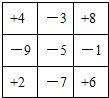 分析:要使三个数的乘积为负则负数的个数必须为奇数,同时还要三个数绝对值的和都相等,而所有的数的绝对值之和为45,所以每一排三个数的绝对值和为15,首先根据绝对值为15把数字排列好,然后根据三个数的乘积为负数确定数的符号.