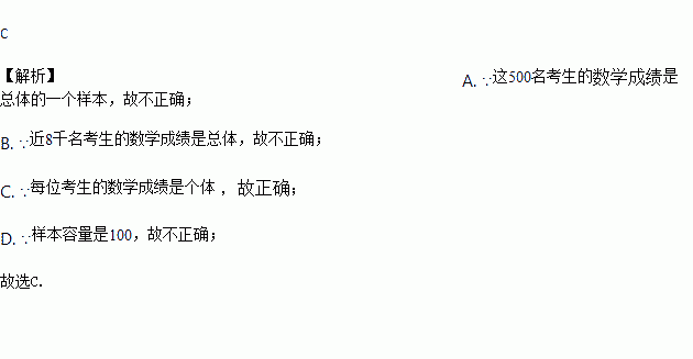 A. 这500名考生是总体的一个样本 B. 近8千名考生的数学成绩之和是总体