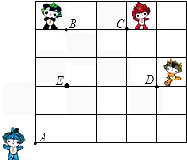 如图,奥运福娃在5×5的方格(每小格边长为1m)上沿着网格线运动.贝贝从A处出发去寻找B、C、D处的其它福娃,规定:向上向右走为正,向下向左走为负.如果从A到B记为:A→B(+1,+4),从B到A记为:B→A(-1,-4),其中第一个数表示左右方向,第二个数表示上下方向,那么图中![]()