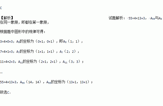 如图,所有正方形的中心均在坐标原点,且各边与x轴或y轴平行,从内到外,它们的边长依次为2,4,6,8 …,顶点依次为A1,A2,A3,A4,A5,…,则顶点A55的坐标是( )