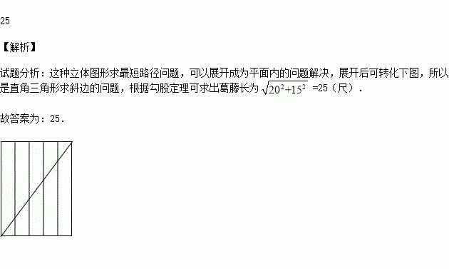 我国古代有这样一道数学问题:“枯木一根直立地上,高二丈,周三尺,有葛藤自根缠绕而上,五周而达其顶,问葛藤之长几何?”题意是:如图所示,把枯木看作一个圆柱体,因一丈是十尺,则该圆柱的高为20尺,底面周长为3尺,有葛藤自点A处缠绕而上,绕五周后其末端恰好到达点B处,则问题中葛藤的最短长度是 尺.