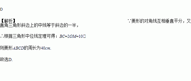 如图,M是菱形ABCD的边AB中点,MO=5cm,则菱形ABCD的周长为( )