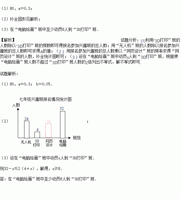 学校计划在七年级学生中开设4个信息技术应用兴趣班,分别为“无人机”班,“3D打印”班,“网页设计”班,“电脑绘画”班,规定每人最多参加一个班,自愿报名.根据报名情况绘制了下面统计图表,请回答下列问题: