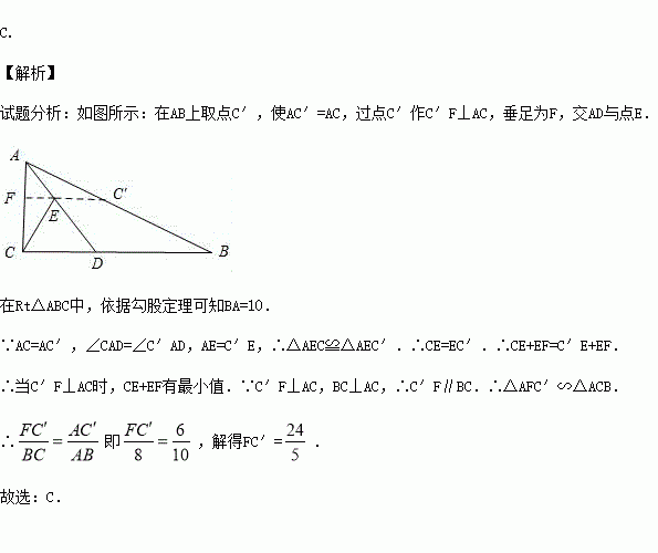 如图,在Rt△ABC中,∠ACB=90°,AC=6,BC=8,AD平分∠CAB交BC于D点,E,F分别是AD,AC上的动点,则CE+EF的最小值为( )