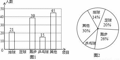 (3)在图2中,“乒乓球”所对应扇形的圆心角的度数为 ;
