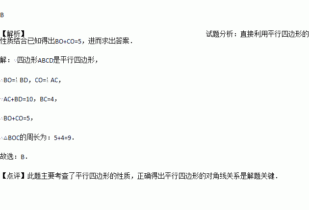 的对角线AC、BD相交于点O,若AC+BD=10,BC=4,则△BOC的周长为( )
