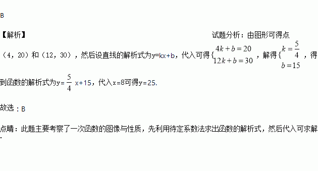 一个有进水管与出水管的容器,从某时刻开始4min内只进水不出水,在随后的8min内既进水又出水,每分钟的进水量和出水量是两个常数,容器内的水量y(单位:L)与时间x(单位:min)之间的关系如图所示.则8min时容器内的水量为( )