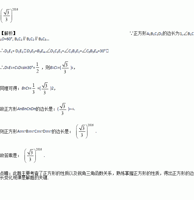 在平面直角坐标系中,正方形A1B1C1D1 、D1E1E2B2 、A2B2C2D2 、D2E3E4B3 、A3B3C3D3 ……按如图所示的方式放置,其中点B1在y轴上,点C1、E1、E2、C2、E3、E4、C3……在x轴上,已知正方形A1B1C1D1 的边长为1,∠B1C1O=60°,B1C1∥B2C2∥B3C3……则正方形A2017B2017C2017D2017的边长是_____.