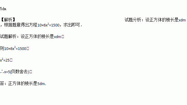 某种油漆一桶可刷的面积为1500dm2,李林用这桶油漆恰好刷完10个同样大小的正方体形状的盒子的全部外表面.已知正方体盒子的外表面是由6个边长相等的正方形围成的,求正方体盒子的棱长.