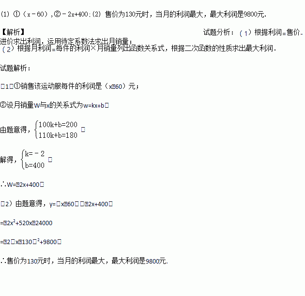 (2)设销售该运动服的月利润为y元,那么售价为多少时,当月的利润最大,最大利润是多少?