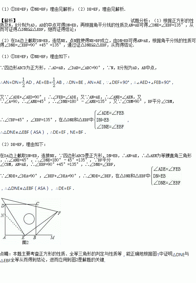 如图所示,四边形ABCD是正方形,M是AB延长线上一点.直角三角尺的一条直角边经过点D,且直角顶点E在AB边上滑动(点E不与点A、B重合),另一直角边与∠CBM的平分线BF相交于点F.