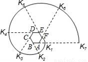 如图,六边形ABCDEF是正六边形,曲线FK1K2K3K4K5K6K7…叫做“正六边形的渐开线”,其中弧FK1,弧K1K2,弧K2K3,弧K3K4,弧K4K5,弧K5K6,…的圆心依次按点A,B,C,D,E,F循环,其弧长分别记为L1,L2,L3,L4,L5,L6,….当AB=1时,L2016等于( )