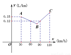 下图中的折线ABC表示某汽车的耗油量y(单位:L/km)与速度x(单位:km/h)之间的函数关系(30≤x≤120)。已知线段BC表示的函数关系中,该汽车的速度每增加1km/h,耗油量增加0.002L/km.