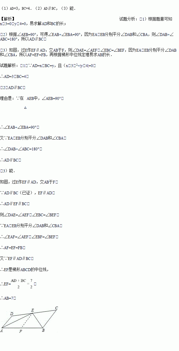 如图:E在线段CD上,EA、EB分别平分∠DAB和∠CBA,∠AEB=90°,设AD=x,BC=y,且(x﹣3)2+|y﹣4|=0.
