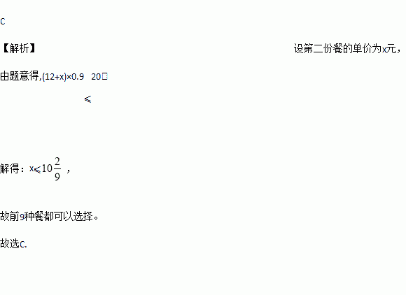 如图为某餐厅的价目表,今日每份餐点价格均为价目表价格的九折.若李心通同学在此餐厅点了橙汁鸡丁饭后想再点第二份餐点,且两份餐点的总花费不超过20元,则他的第二份餐点最多有几种选择( )