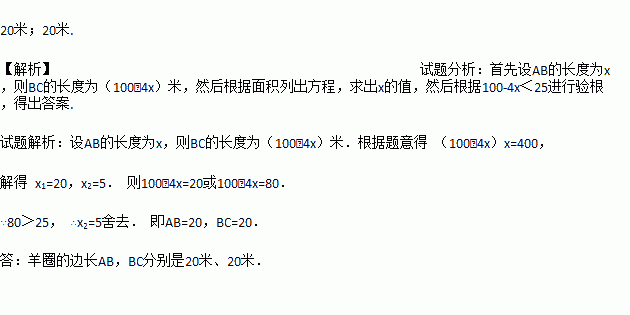 如图,要利用一面墙(墙长为25米)建羊圈,用100米的围栏围成总面积为400平方米的三个大小相同的矩形羊圈,求羊圈的边长AB,BC各为多少米?