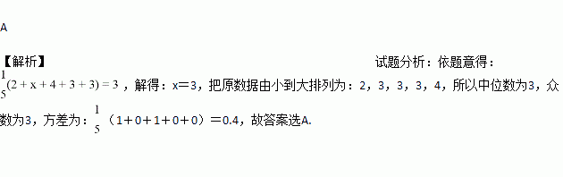 一组数据2,x,4,3,3的平均数是3,则这组数据的中位数、众数、方差分别是( )