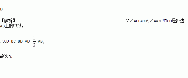 如图,在Rt△ABC中,∠ACB=900,∠A=30°,CD是斜边AB上的中线,则图中与CD的长度不相等的线段有( )