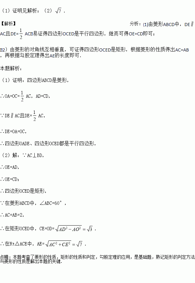 (2)若菱形ABCD的边长为2,∠ABC=60°,求AE的长.