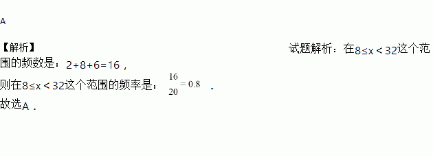 某棉纺厂为了解一批棉花的质量,从中随机抽取了20根棉花纤维进行测量,其长度X(单位:mm)的数据分布如下表所示,则棉花纤维长度的数据在8≤x<32这个范围的频率为