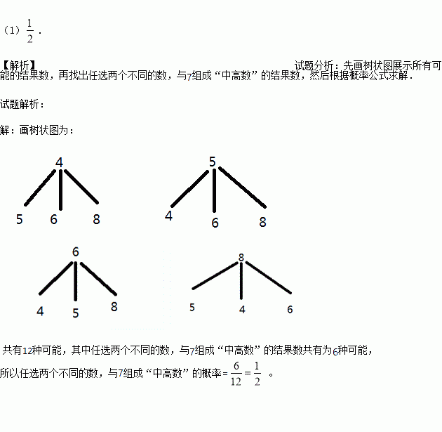 若十位上的数字比个位上的数字、百位上的数字都大的三位数叫做中高数,如796就是一个“中高数”.若一个三位数的十位上数字为7,且从4、5、6、8中随机选取两数,与7组成“中高数”,那么组成“中高数”的概率是多少?(请用“画树状图”或“列表”等方法写出分析过程)