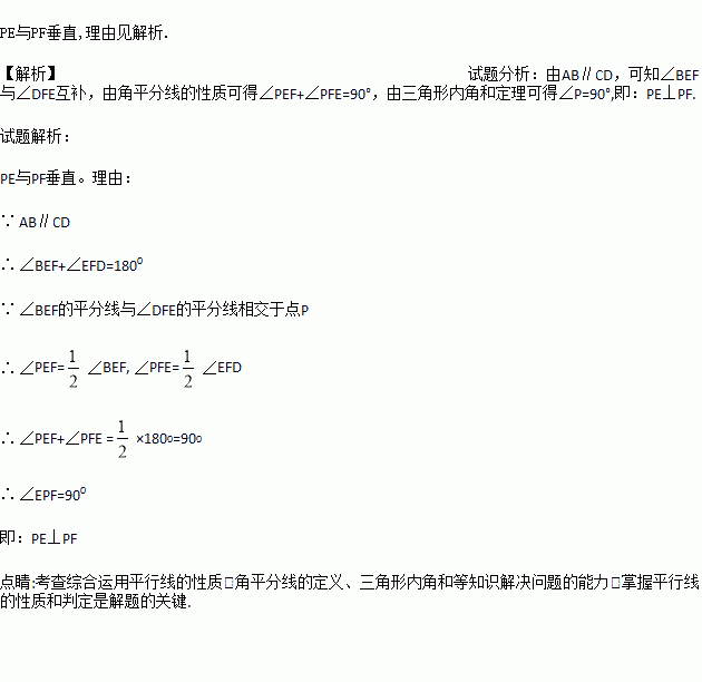 已知:AB∥CD,直线EF分别交AB、CD于点E、F,∠BEF的平分线与∠DFE的平分线相交于点P.试判断PE与PF有什么关系,并说明理由.