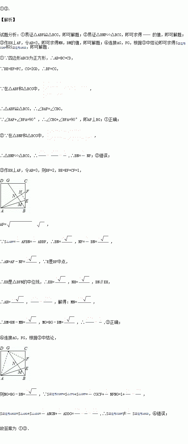 如图,正方形ABCD中,BE=EF=FC,CG=2GD,BG分别交AE,AF于M,N.下列结论:①AF⊥BG;②BN=