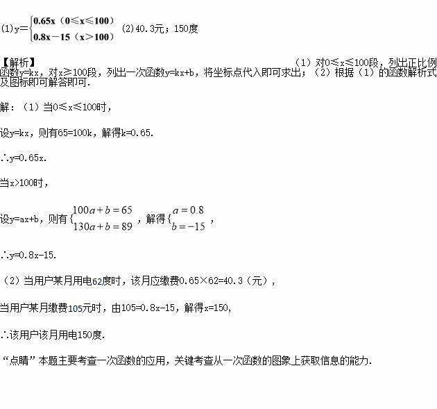 电力公司为鼓励市民节约用电,采取按月用电量分段收费的办法,已知某户居民每月应缴电费y(元)与用电量x(度)的函数图象是一条折线(如图),根据图象解答下列问题.
