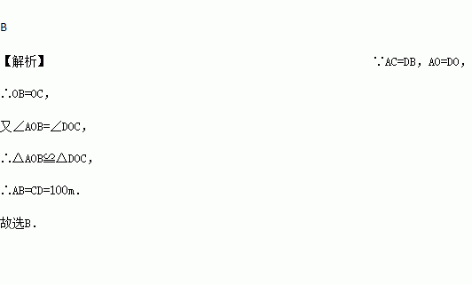 如图所示,已知BO=OC,AO=DO,CD=100m,则A,B两点间的距离( )
